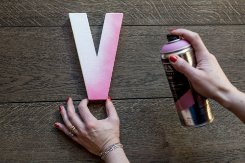 - Protégez votre plan de travail avant de bomber les lettres avec de la peinture en spray, de la couleur de votre choix, le plus régulièrement possible. (Ne pas pulvériser trop près, à 30 cm environ).